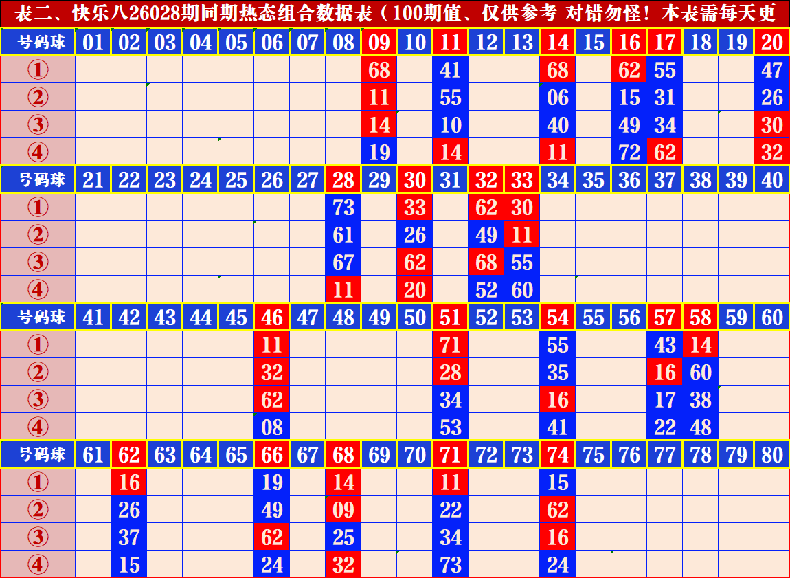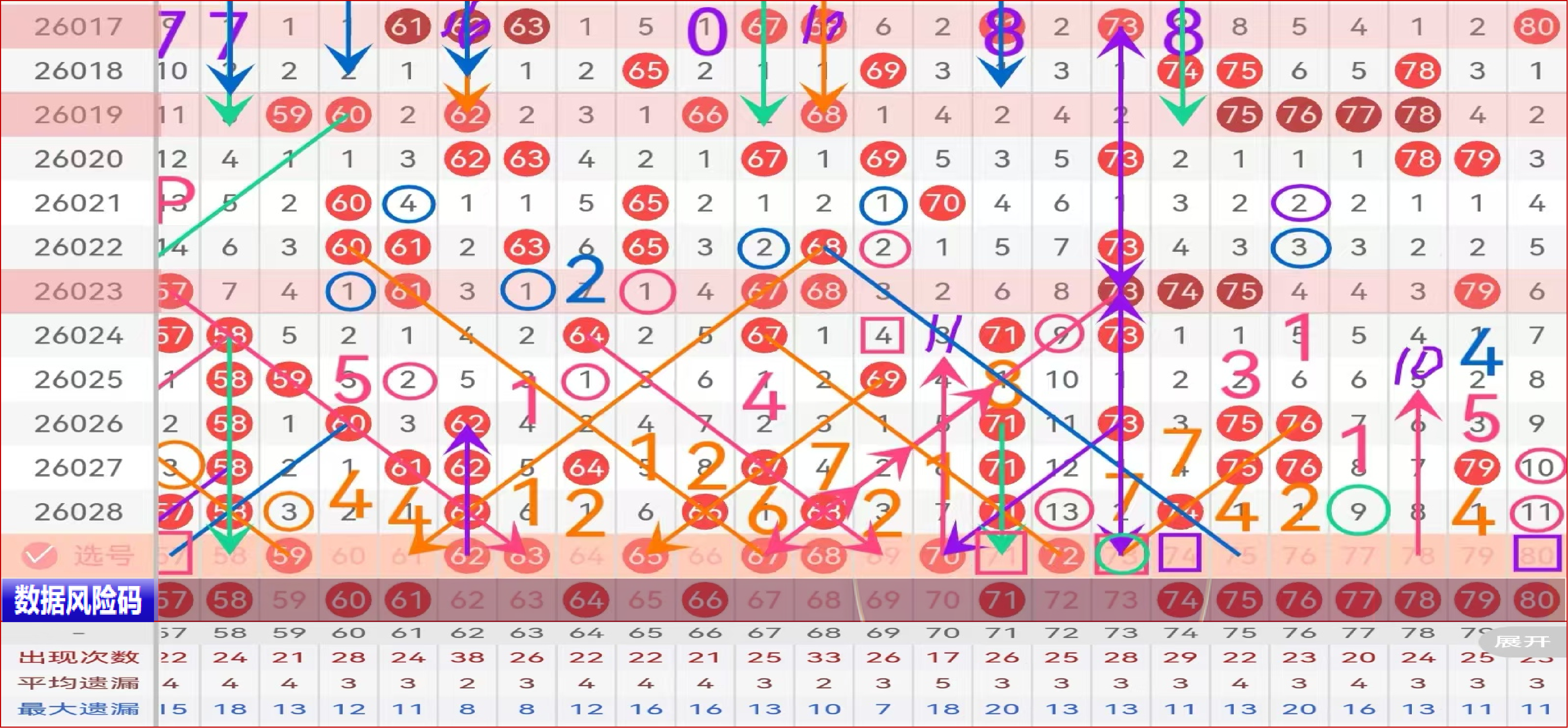 四区间上期开出了5个号码球,均值开出;上期62走三重,本期四重必防,可带上分边63做连号防守,二择一主做推荐62四重码;这里的65 69本期可二择一选择性做号,推荐65的6期值回补;6字头尾部看好68,带上67的梅花做连号防守,二择一主做推荐68走重;区间中部的70可防守回补;大遗漏三码72 44 80,三择一推荐72主防,带上73做连号防守;7字头其他号码球,本期判定风险码,九哥不看好,也拿不准,你们自己去琢磨吧;