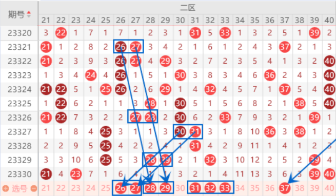 该区间的26 27 28 29号数字我们要注意出连号的可能,本期这里的都是连号的斜连情况,应该是有号码的,我们要注意一下。本期的31 32号数字我们要注意一下,31 32号这个连号最近应该是要开出来了,可以追一下号码的。本期的33号数字我们注意一下,最近32空一期带33的情况很多,我们可以做一下防守。本期的37号数字是属于三斜连号码,可以防守一下的。