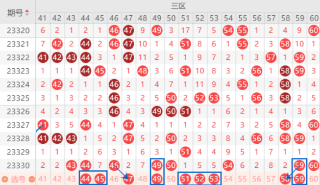 上期开出了43 44号数字,本期我们注意一下出一个重号的情况,夹号45号数字我们也是要关注一下的,可以防守一下44 45号数字同出的情况。本期的49 50号数字我们也是要注意一下出重号的情况,重点关注一下49号数字出号情况。本期的51 52 53号数字我们注意一下,这里应该也是要出号的,可以重点关注一下51 53号数字的出号情况。上期开出了59 60号数字,本期我们注意一下出重的情况,本期的58号数字我们也是要注意一下的。