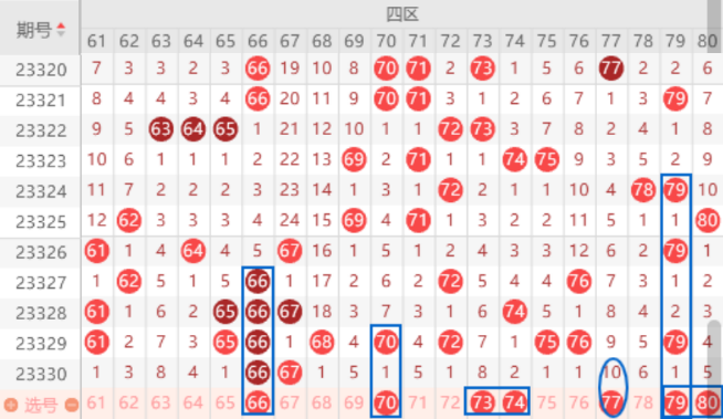 该区间的66号数字我们要注意走5重号的情况,最近几期都没有出现5重号了,本期有可能是个契机。上期直播间是就说了68-72之间存在断号的风险,果然是断号了,那么本期应该是要进行回补了,我们要注意一下。本期的73号数字是属于遗漏8期的号码,本期遗漏8期的号码有三个,本期应该是要出一个号码的,我们要注意一下。本期的79号数字是属于121走势,注意出号情况,可以防守一下79 80号数字同出的情况。