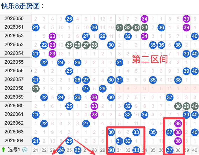 上期二区开出5个奖号(21.25.31.32.38)上期回顾二区开出5个奖号二区间在上期落位同比前期的话呈现了一个递减的落位趋势,先来看本期号码24整体活跃度较温冷,在近 30 期里有一定的间歇性出现,不是每期都开,近期整体走势还不是很稳定。号码26近期热度较温热,间隔性整体比较一般,说明其在当前阶段活跃度较温热注意防守。号码30近期活跃度较温热有一定的间歇性近期整体走势相对还是平稳有特别明显的冷热趋势变化,号码3730期内活跃度较温冷有明显的连续出现形态走势,整体表现比较温冷