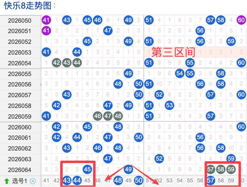 三区间开出了5个奖号(45.49.57.58.59)上期回顾三区开出5个奖号上期的三区间的奖号数量呈现一个递增的形态,4头回补2码,本期先来看号码43期出现频率相对来说是很稳定。偶尔有时间隔期数也是很长,但是在近期的开奖中较,号码48在近 30 期内出现次数相对较稳定的号码,近期的活跃度也是较。号码50有一定的间歇性,通常间隔5-3期会出现一次,有明显的连续出现态势,走势相对还是很稳定,在整个第三区间的表现本期还是可以防守的。号码57走势相对近期较,近期有连续间隔落号的情况,活跃度近期处于状态注意防守。