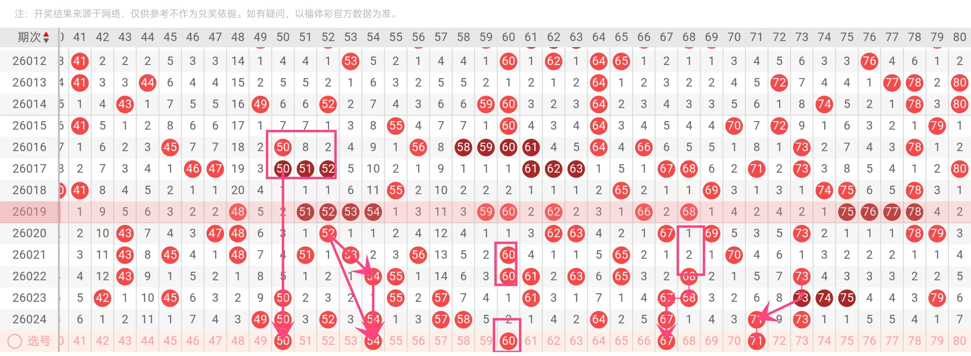 50在2026023、2026024期连续开出,是明显的热号。尾数为0的号码(如10、20、30、50)在近期出现频率上升,50作为大号区(41–80)的代表,有望继续出现。