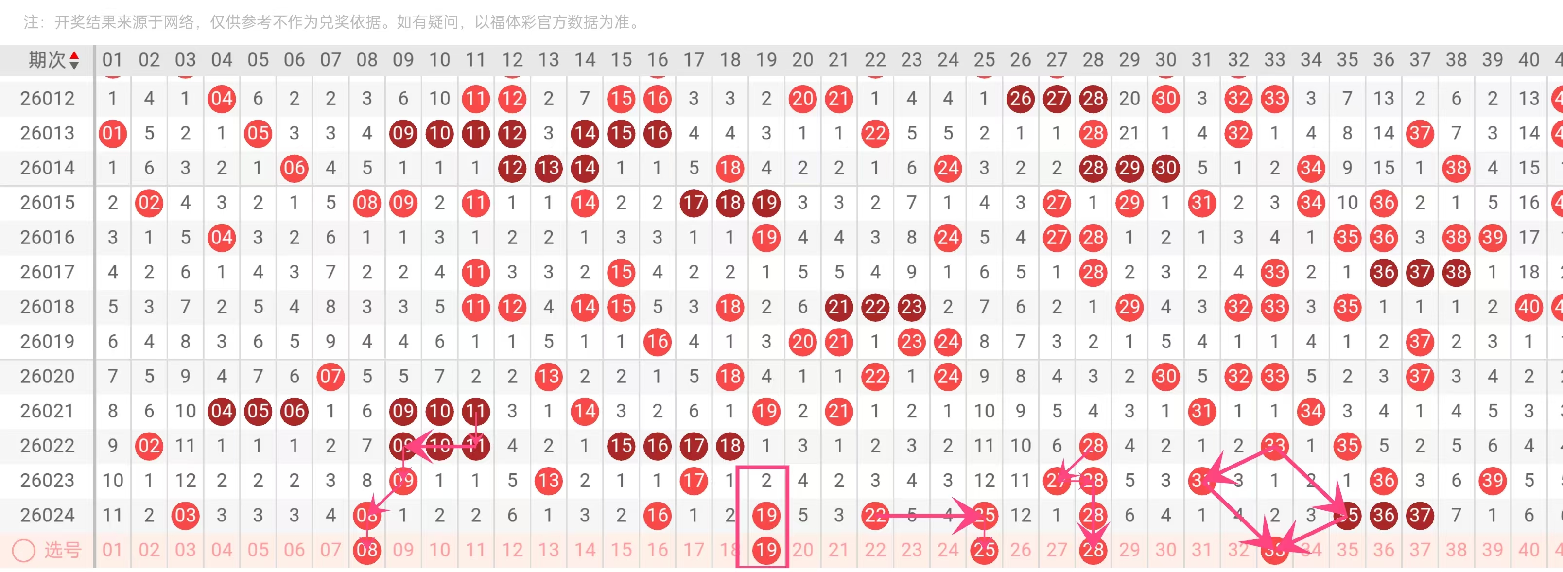 最近5期中,19在2026021、2026023期连续出现,属于近期明显热号。同时,10–25区间在近5期出现频率较高,19正处于该区间的中段,具备较强的延续性。