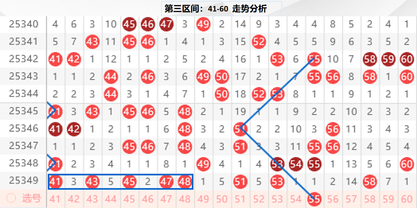 三区分析:【41-60】(走势图标注号码非小黄车大底,请谨慎参考,具体思路将在直播间分享讨论)