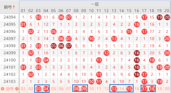 本期的01 02 03号数字我们做一下防守就行了,本期不一定会出号码的。本期的04号数字我们可以关注一下出号情况。本期的05 06 07号数字是有机会继续断号的,所以不建议定胆码。本期的08 09号数字我们注意出一个号码的情况。本期的13 14 15号数字我们要注意出一个号码的情况,其中的14号数字出号机会不是很大,所以我们重点关注一下13 15号数字出一个号码的情况就行了。上期开出了17 19号数字,本期的18号数字我们注意一下出号情况。