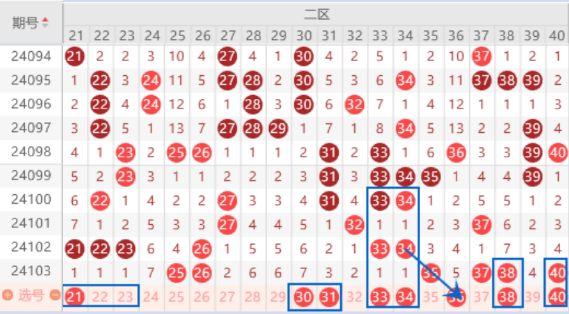 上期的三连号21 22 23号数字没能开出重号来,本期我们注意一下出一个号码的情况,重点关注一下21号数字的出号就行了。本期的30号数字是属于遗漏7期的号码,本期遗漏7期的号码有5个,出一个号码的是没有问题的。本期的33 34号数字我们注意落下一个号码的情况,可以重点关注一下34号数字的出号情况。上期开出了35 37 38 40号数字,本期我们要注意一下出一重号和一夹号的情况,可以重点关注一下36 38 40号数字的出号情况。