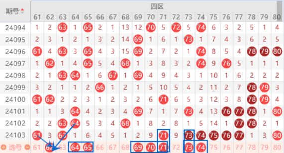 本期的62号数字我们注意一下出号情况,属于423走势,出号机会是有的。本期的64 65号数字我们注意出一个号码的情况,重点关注一下65号数字的出号情况。本期的69号数字是属于空2对称号码,出号机会还是有的,我们要关注一下。上期开出了71 73 74 75 76 77号数字,本期这里我们注意一下出重号的情况,重点关注一下71 73号数字出一个重号的情况就行了。