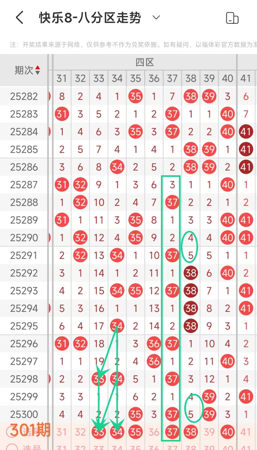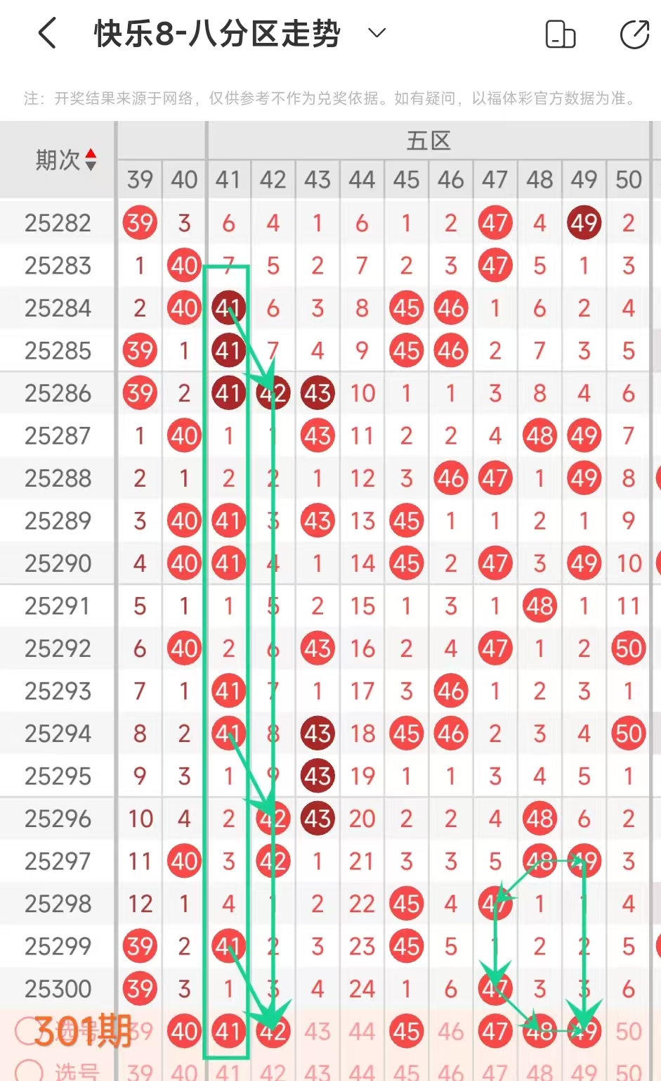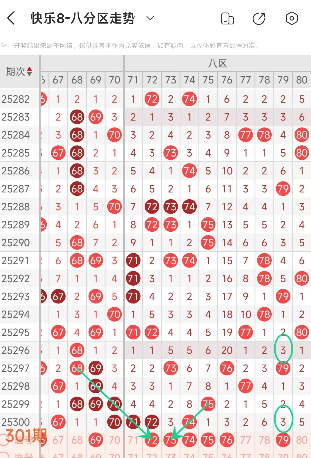 在快乐8的探索之旅中,通过对开奖走势图细致入微的观察,我们总结出一些具有参考价值的规律。几乎每一期开奖号码都呈现出以下显著特征:其一,大概率出现连号;其二,常常伴有边码;其三,遗漏值为1 2 3的号码频繁现身;其四,重号现象也较为常见。掌握这些要点,能为我们的投注提供方向指引。我们约定采用八分区走势图来展开分析。