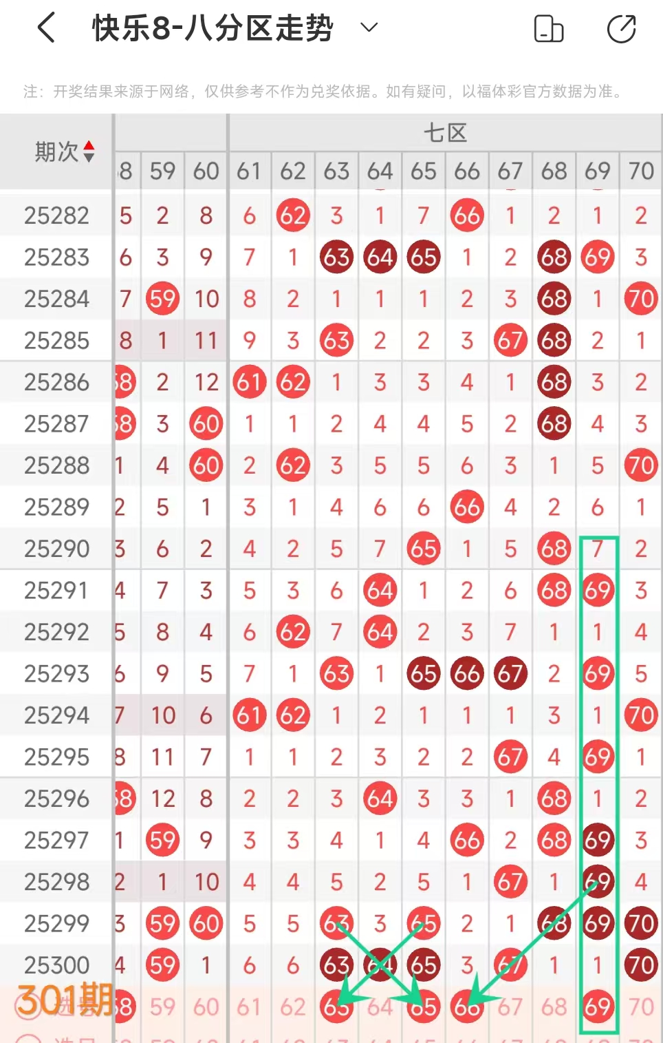上期七区开出 63 64 65 67 70这5个号码,本期考虑出4个左右。