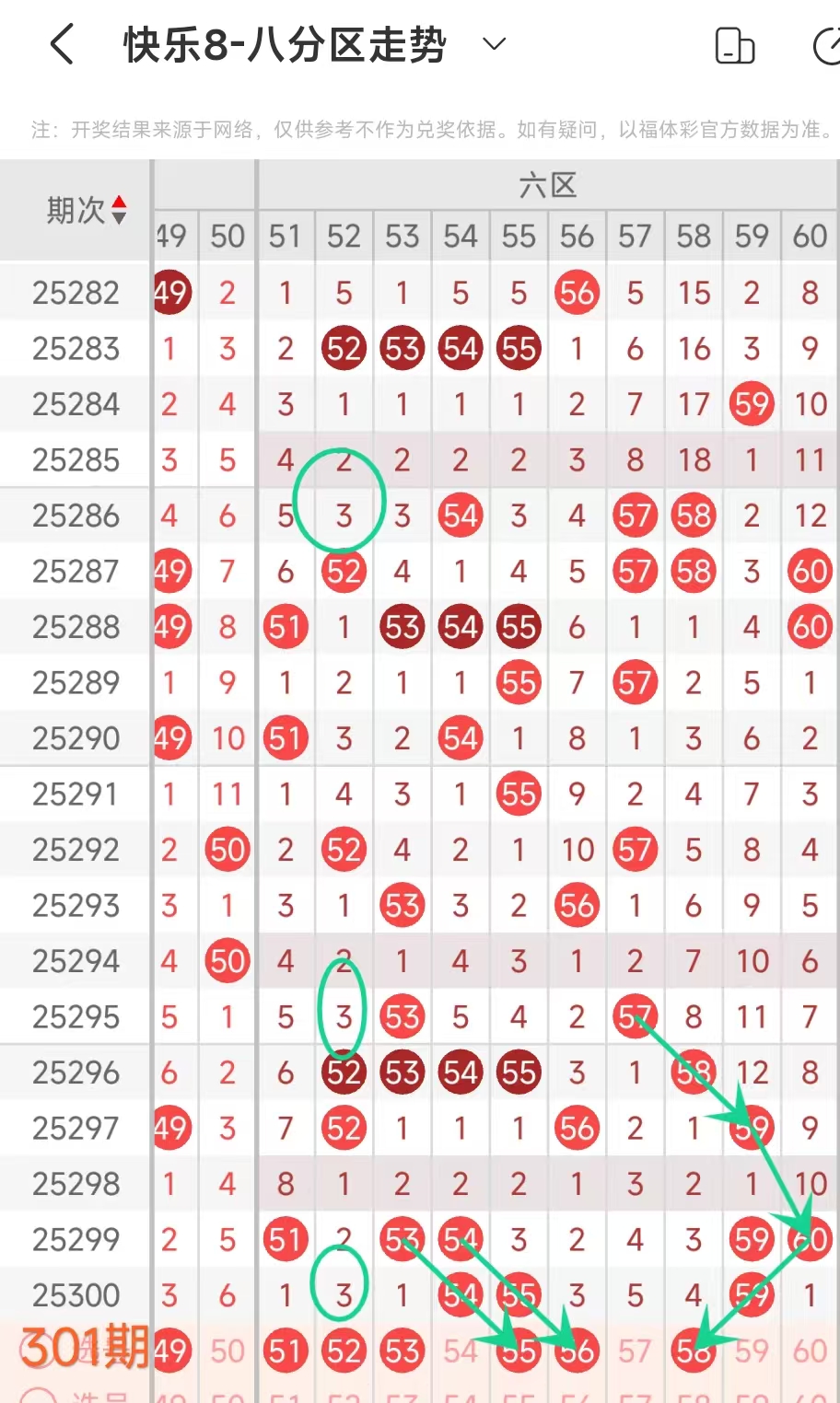 上期六区开出 54 55 59这3个号码,本期应该出3个。