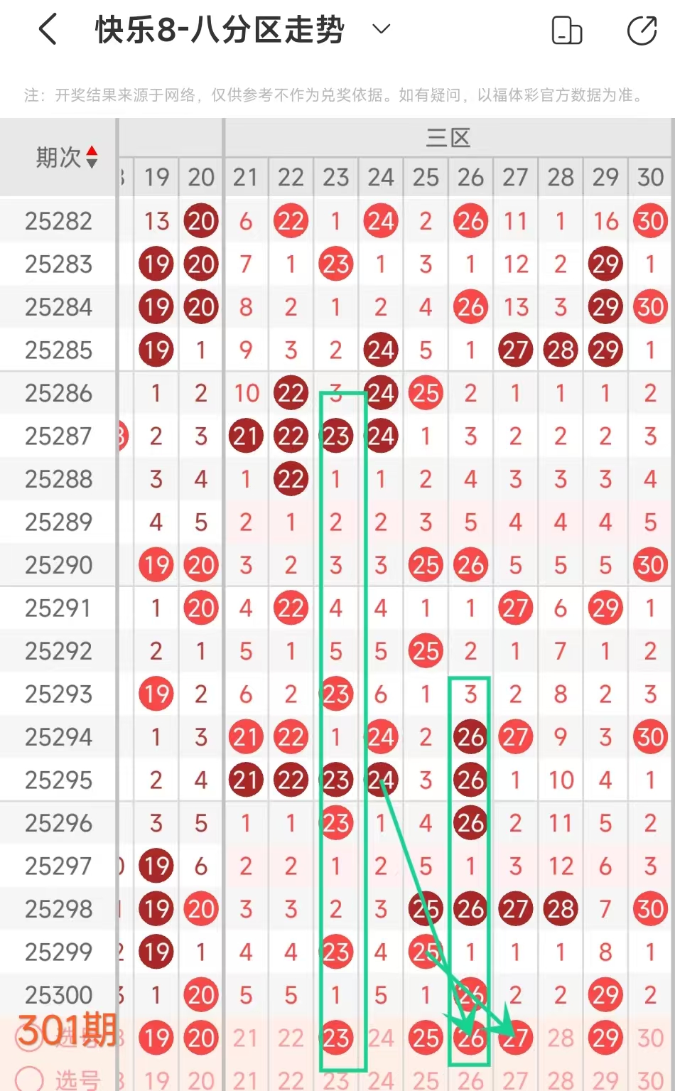 上期三区开出26 29这2个号码,本期考虑2个。