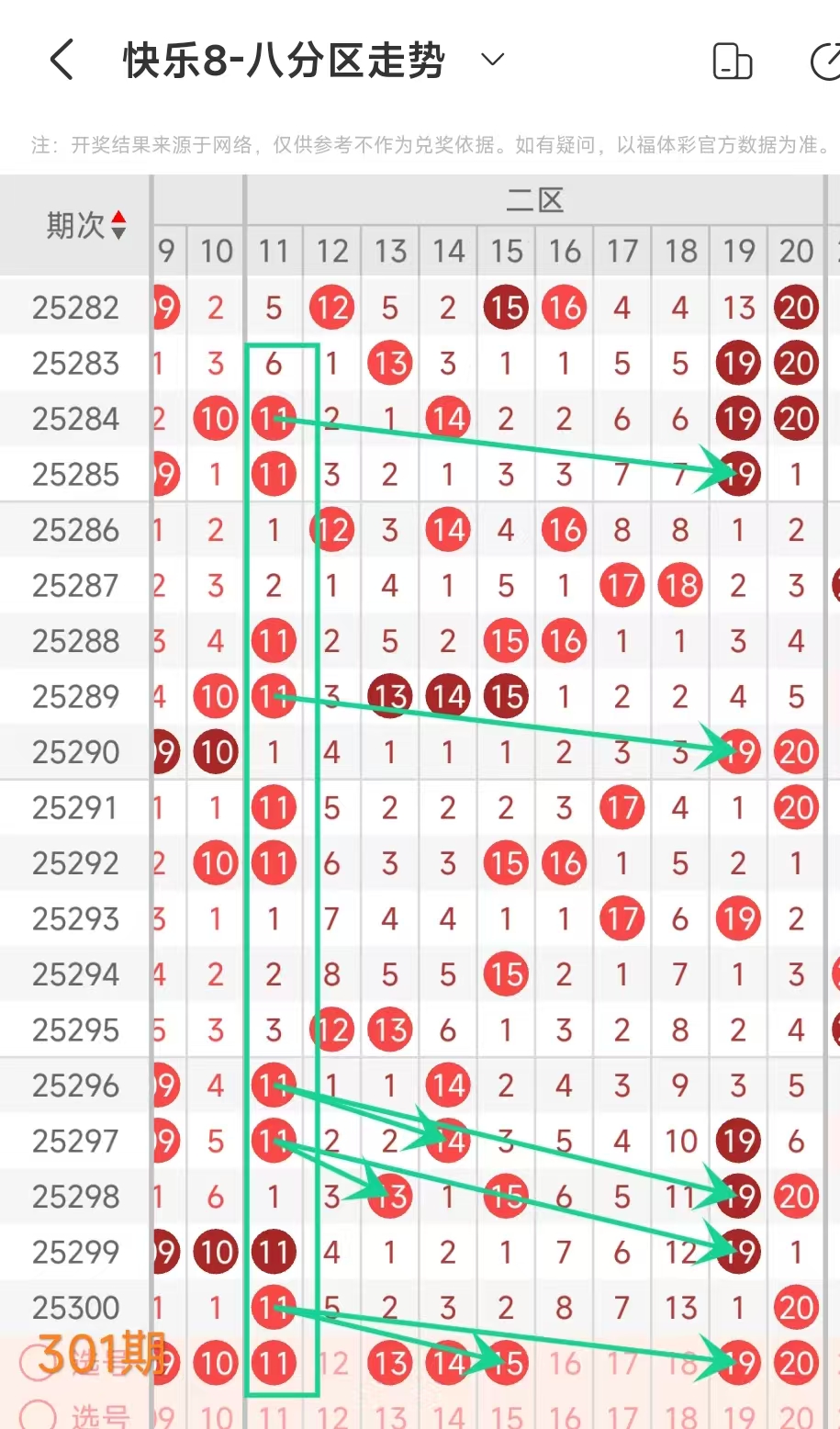 上期二区开出11 20这2个号码,本期应该出2个左右。