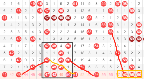 第三区间号码41-60,第三区间这一期应该不会太弱,上一期一区那么强势,三区都能保留基本走势。那这一期的话三区可以根据走势重点关注一下。