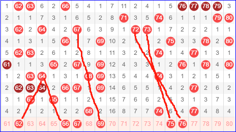 第四区间号码61-80,四区这样出号的结果也是在意料之中,昨天虽然防守了一注,但只出现了三个号码。但是这一期应该是一个机会,上一期虽然做的走势号码比较多,那盒大趋势一般不会出现在四区。如我们所料,始终是不看好四区后半段的。
