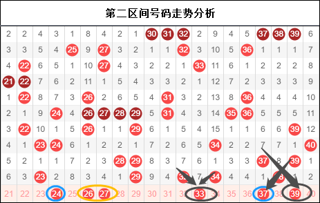 第二区间依然还是没有出现我们期待的走势,甚至昨晚的开奖号码全部都是单兵作战。接下来依然是大家注意防守的重要区域,没有之一。一旦成形,二区将会是你节前重点收获的区间。图中为大家分析了可能要面临的走势,但是在第二区间上不要忘了一个重点,单兵作战的时候注意重号和邻号的防守。