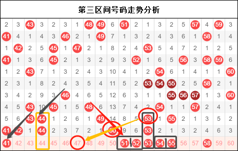 第三区间号码依然还是前移,整体上以重号和走势号码为主。接下来方向上不会有太大的差异。本期需要注意的重点是注意连号的出现,尤其是三区面前面临的所有重号中,全部都是以两重号的模式往下拉,但是借鉴以下四区走势,昨晚四区的72首次打破规则出现三重号,所以今晚三区一样有可能冲破当前走势。当然了如果出现连号,那连号之中必然会包含重号,这样一来走势上大家应该就很明确号码的走向了。我们图中也为大家提供了一些参考,希望如我们所愿。