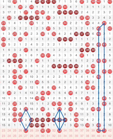 27 30 31今天这个号是有机会开出组合的,27它是一个非常漂亮的菱形号,30 31两个码对子今天我比较喜欢,很可能会开出一码;31是一个规律号,今天这个31 38选一个号是非常稳妥的; 31 33今天是一个非常漂亮的二选一位置, 是个同区间的热形态,40 41这里看的是有机会开出一码组合,而且41有机会开出同形态的号;