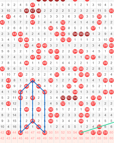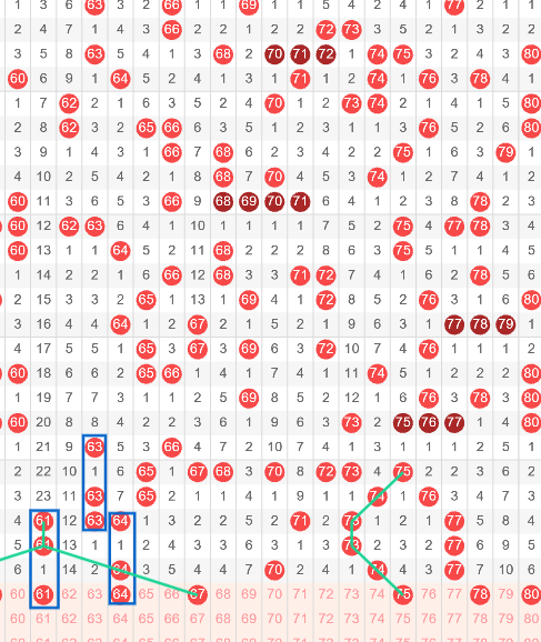 61 64今天是有机会开出一码的,这种热形态,55 67也是二选一位置,70 72是往期热组合,今天是白期的规律组合,74 75 这里选择做选一比较稳妥;78 80的可以选择一码,有机会开出一码当凤尾;