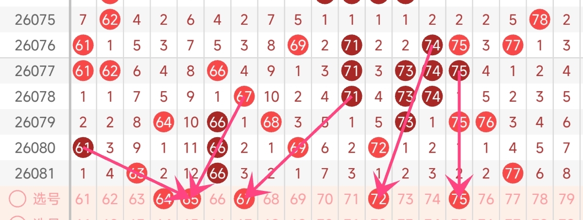 从走势来看,上期四区仅开出3枚奖号,符合近期大号区整体偏冷的走势规律,本期预计维持3-4枚的低出号量,无需过度重仓。从号码特征看,66在上期开出,且属于近期频繁出现的重号,本期可继续跟进,61、62作为斜连组合,形成连号的概率较高,近期连号整体活跃,中小号连号已经充分开出,大号区连号存在补开需求。而且还需注意其他已经连续多期漏出的号码,本期有几率回补。综合考虑,本期四区推荐关注号码:64、65、67、72、75。