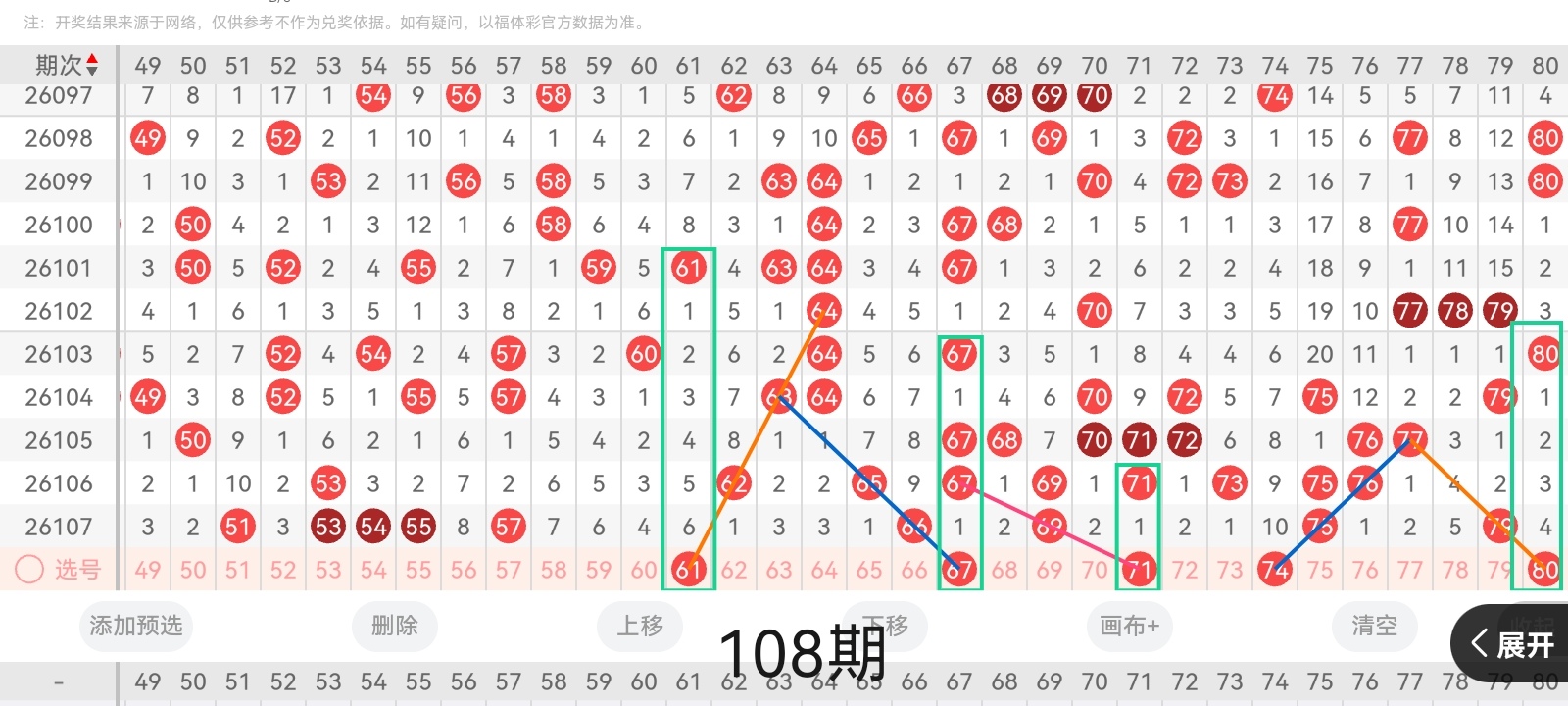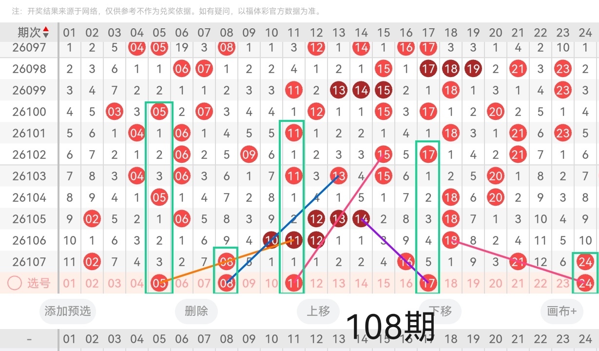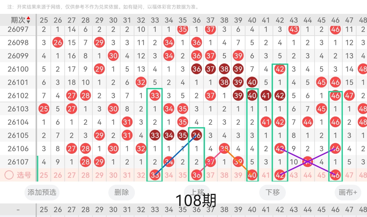 通过以上对上期的简单回顾,下面进入2026108期(下面简称本期)的选号分析: