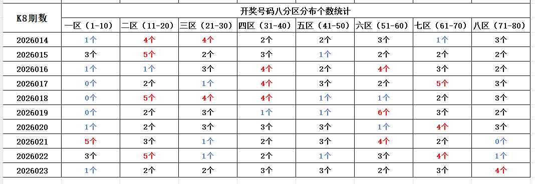 如图,红色字体是热号区,区间开出4个及以上号码。蓝色字体是冷号区,区间开出1个及以下号码。以近10期为一个分析周期,依据久热必冷,久冷必热的规律,本期重点关注:八区,区间可能开出3-4个号码。一区,区间可能开出1-2个号码。个人分析,仅供参考。