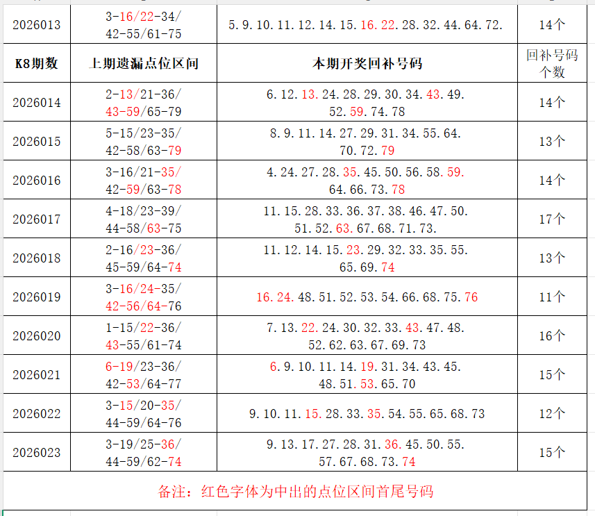 如图,上期的遗漏号码在下期开出10个左右,即为回补号码。定准点位区间首尾号码是关键!以上期2026023期为例,定位4个遗漏区间,围中15码!结合上期开奖号码,以跨度值大于或等于7为依据,本期关注2个遗漏区间:1-9/17-27;重点关注遗漏区间:6-16/23-35/44-56/62-78。点位区间号码和大底号码请勿混淆,个人分析,仅供参考。