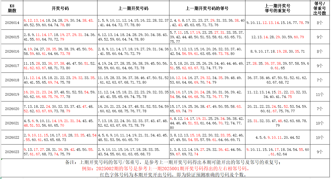 如图,红色字体是上期邻号、邻重号在下期开出,每期开出10个左右。上期邻号开出5个,邻重号开出4个。本期参考邻号:8.10.12.14.16.18.26.29.30.32.35.37.38.40.41.43.44.46.49.51.54.58.60.62.66.69.72.76.78.80;邻重号:27.28.56.67.68.73.74.75;个人分析,仅供参考。