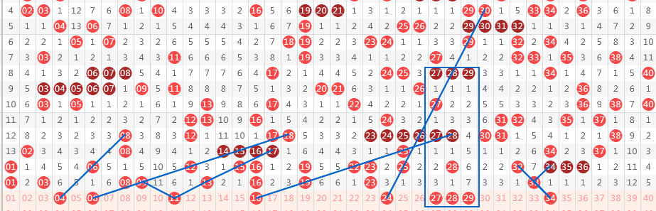 【第一区间1-40】上期开出9个号码。本期分析推荐:04-06-11-16-24-27-28-29-34九个号码。04偶数斜连、偶数间隔3等距斜连号码,在接连二期奇数龙头之后,考虑偶数打头;06同路五期号码,同时考虑上期同路遗漏补缺(上期同路出03-09);11奇数斜连号,也属中间形态号,出号概率较大;16与06同形态,区别在于16四重,作为防守;24-34斜连三期号码,考虑区间同尾开出;27-28-29区间连号周期回补开出形态。区间推荐重点号码:一小区间04-06-11,二小区间24-28-34。