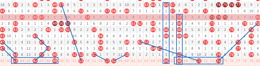 【第二区间41-80】:上期开出11个号码。本期推荐:43-46-49-53-57-58-66-68-71-74十个号码。43-46-49主看此号码区以同路形态出号,其中46为三斜连号码,属此区间最常见出号形态;53斜连四期号码,43-53主看区间同尾,以及上期3尾爆号之后的重号形态;57-58为中间对子;66上下对称号码;68逐步走热,看重;66-68同时考虑以区间偶数二连回补形态;71同路四期,与同路三期的74和68形成此区间同路出号趋势。区间推荐重点号码:三小区间57-58,四小区间68-71-74。