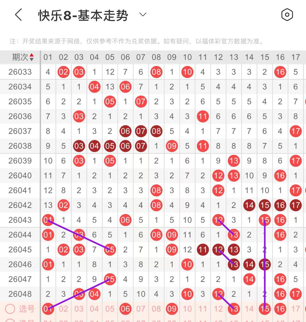 01-10区:本区间上期开出了三个号码,从号码走势图上看,本期出号个数应该还能保持在两三个号码左右,有出号走势的号码有01号,斜连出号走势,防01.06同出的可能,09号,做为边号开出。