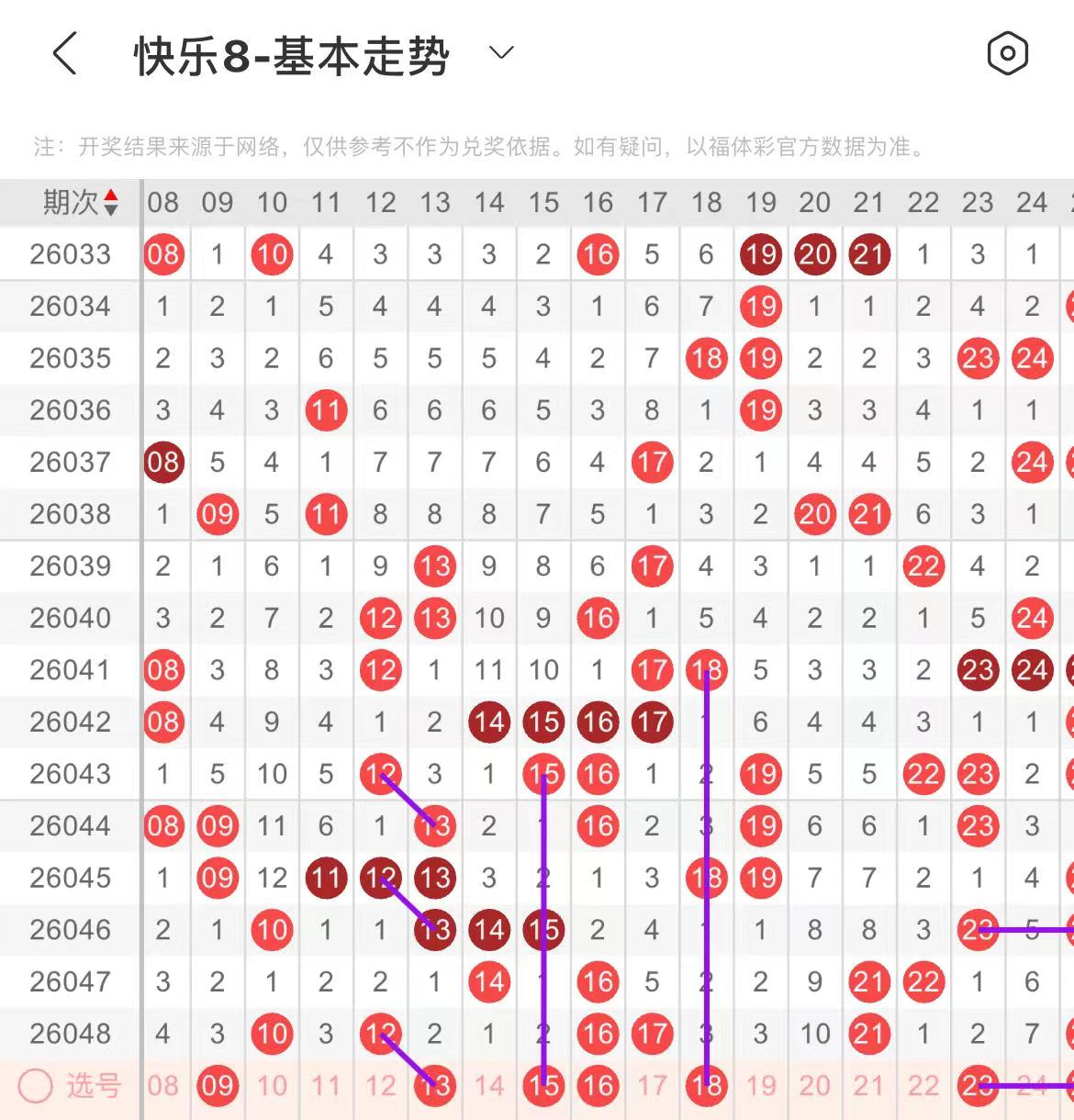11-20区:本区间上期开出了三个号码,从号码走势图上看,该区现属于热号区,继续看好该区号码持续走高位,出号个数在三个号码或者以上。有出号走势的号码有13号,12对应13出号走势,15.16号,同出,形成一个反L字走势形态,18号,隔期相同出号走势。