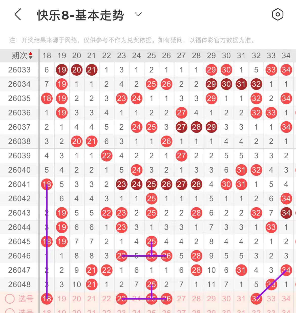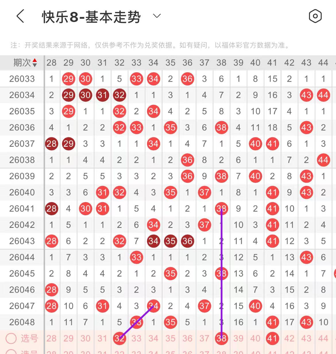 31-40区:本区间上期开出了两个号码,从号码走势图上看,该区现属于温冷区,出号个数在一两个号码左右,有出号走势的号码有32号,斜连出号走势,38号,隔期相同出号走势。