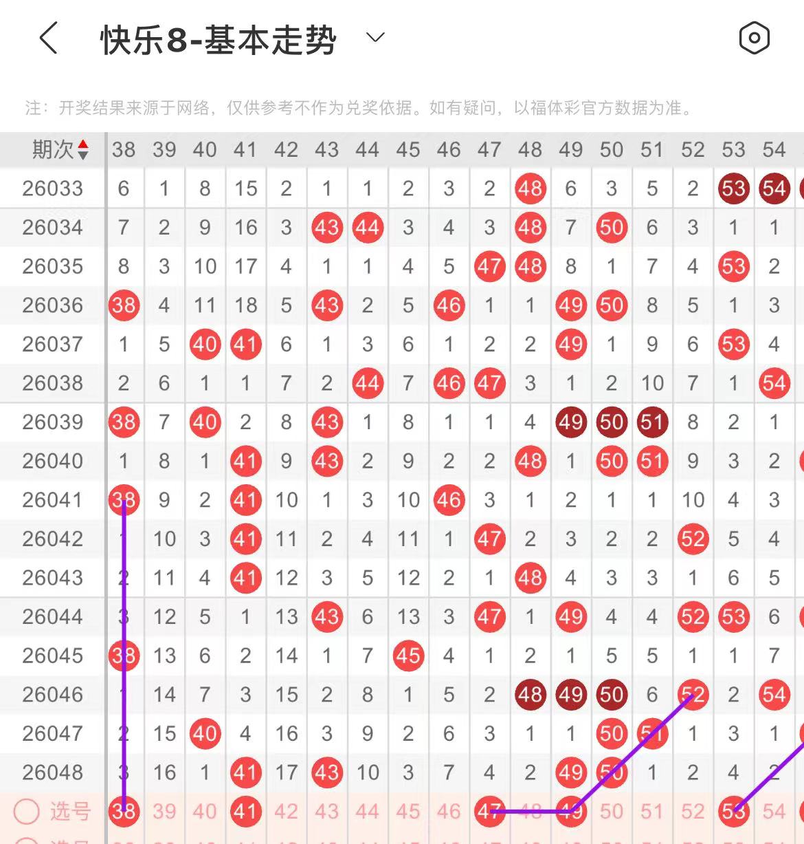 41-50区:本区间上期开出了四个号码,从号码走势图上看,本期继续关注区头区尾号码回补,出号个数在两个号码左右,有出号走势的号码有41号,走重的可能,49号,斜连出号走势,防47.49同出。
