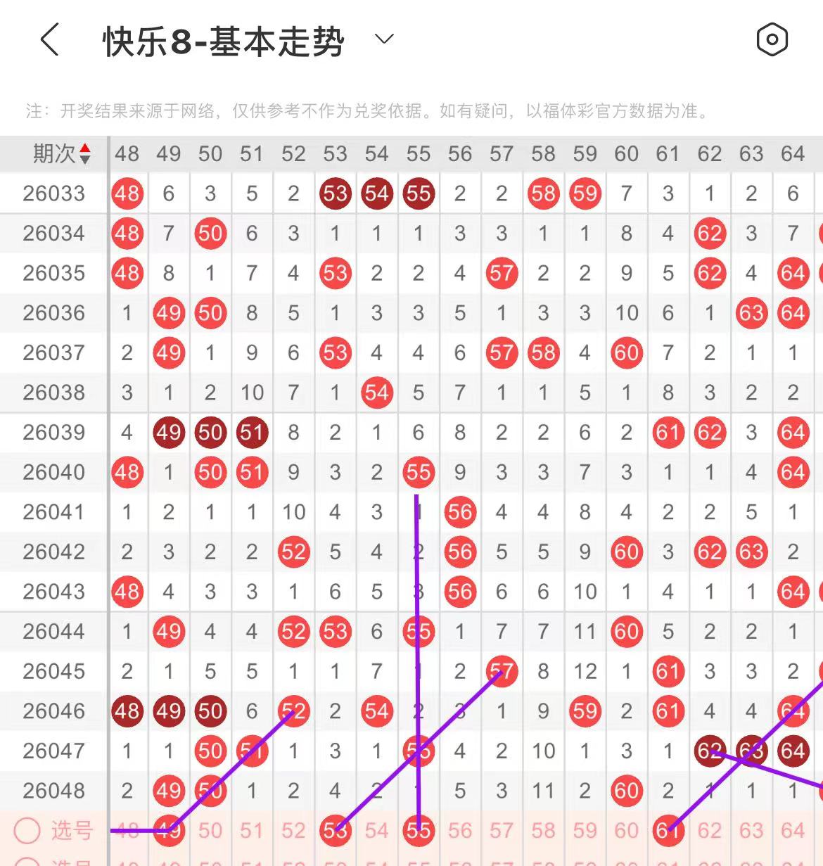 51-60区:本区间上期开出了一个号码,从号码走势图上看,本期可参考的号码走势甚少,在选号上需谨慎,出号个数在两个号码左右,有出号走势的号码有53号,斜连出号走势,55号,隔期321出号走势。
