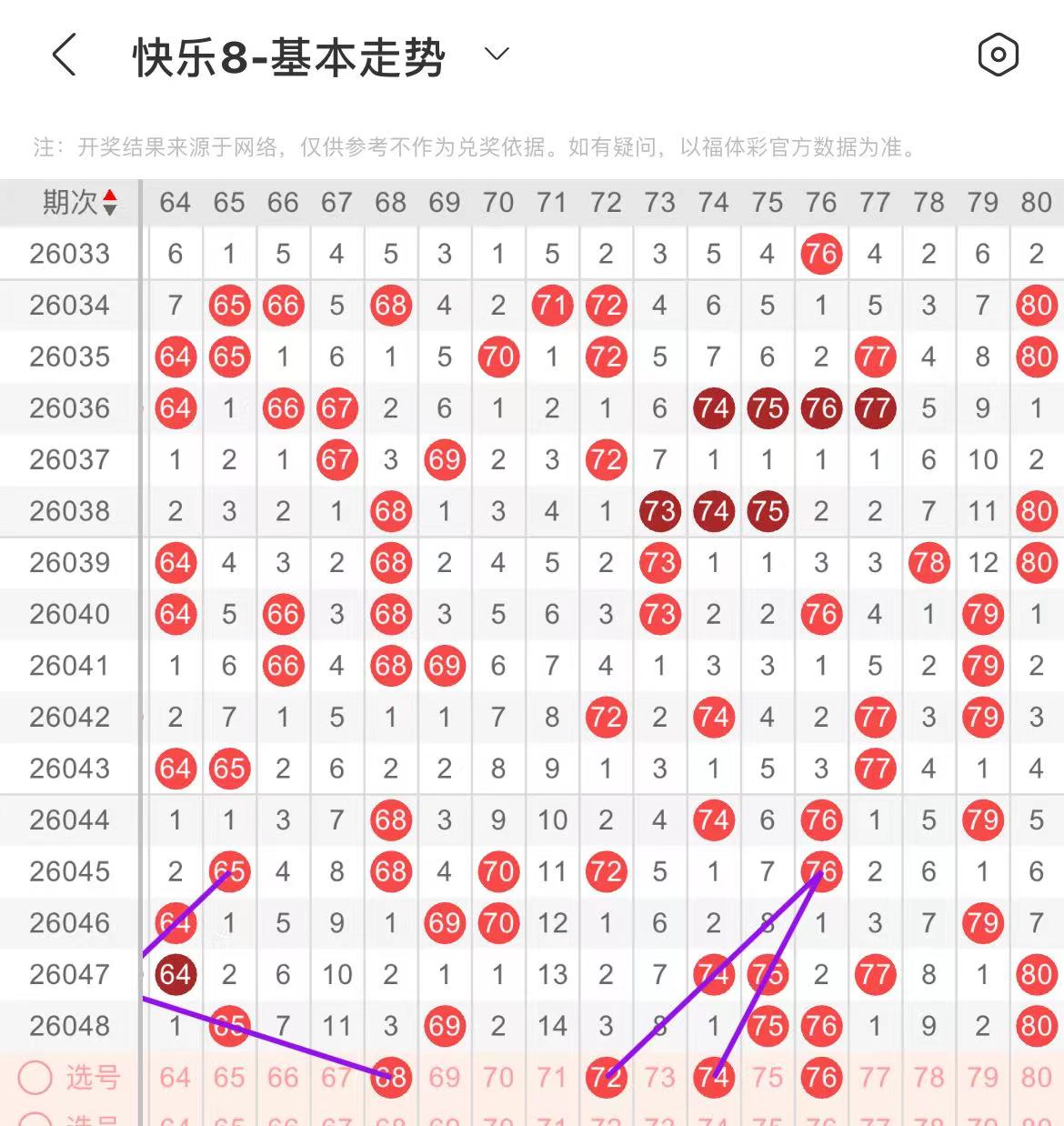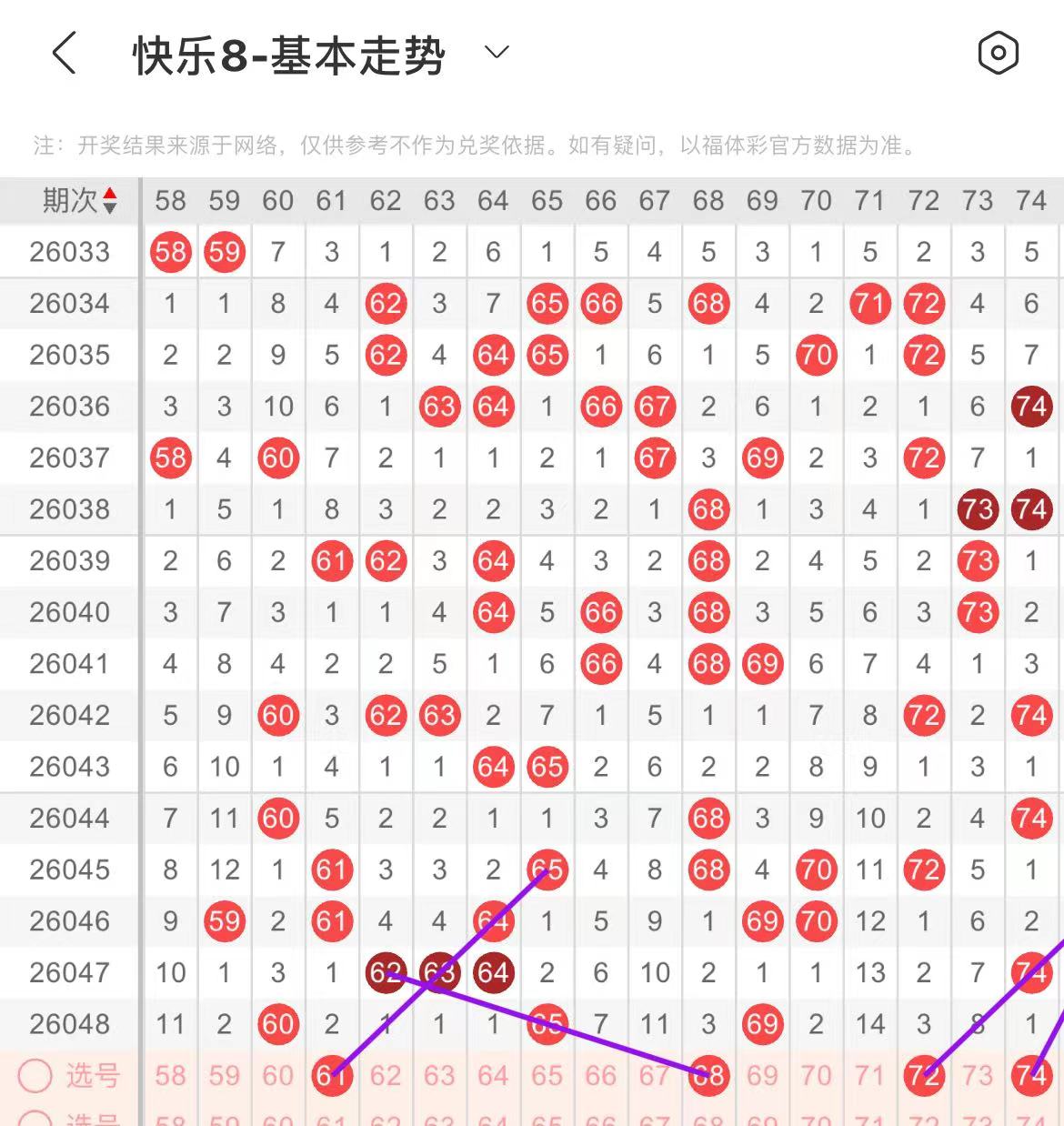 61-70区:本区间上期开出了两个号码,从号码走势图上看,该区号码走势有走温冷的趋势,在选号上更多的是以防为主,本期出号个数在一两个号码左右,有出号走势的号码有61.68号,均有斜连出号走势。