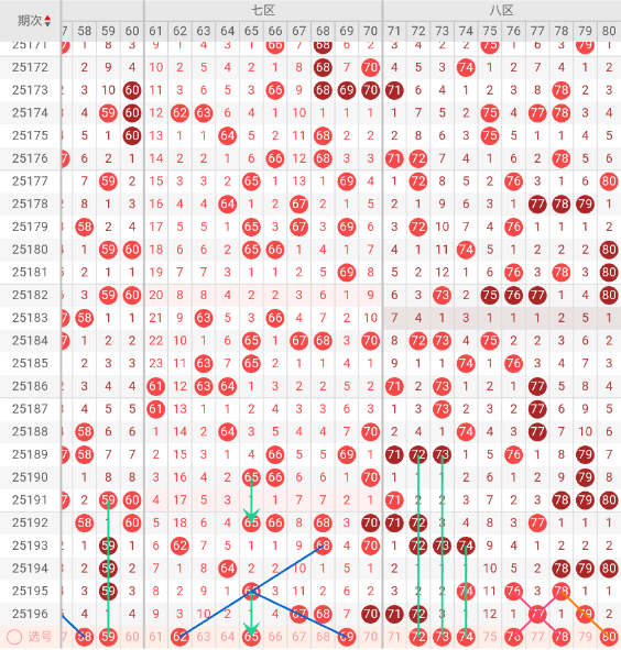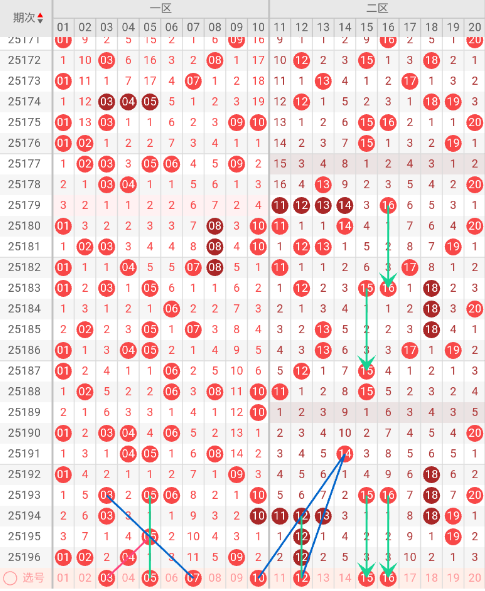 结合上期的数据分析,对快乐8第25197期的推荐如下: