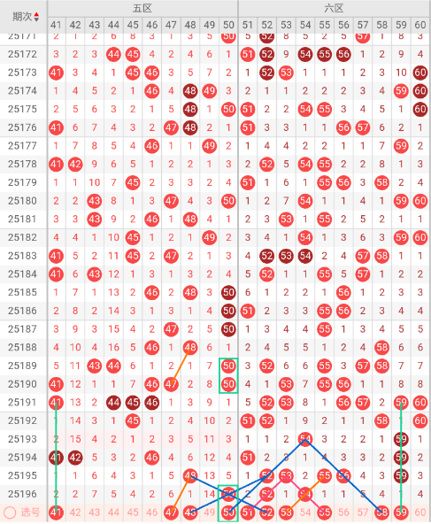 五区开出:50 奇偶比: 0:1 和值:50 跨度:0,上期开出1个号码,偶数。本期无三斜连走势,隔码斜连走势:48 50。近5期出号量:1-0-3-1-1,近10期平均出号2.1枚,上期奇偶比:0:1,本期推荐关注号码:41、47、48、50。