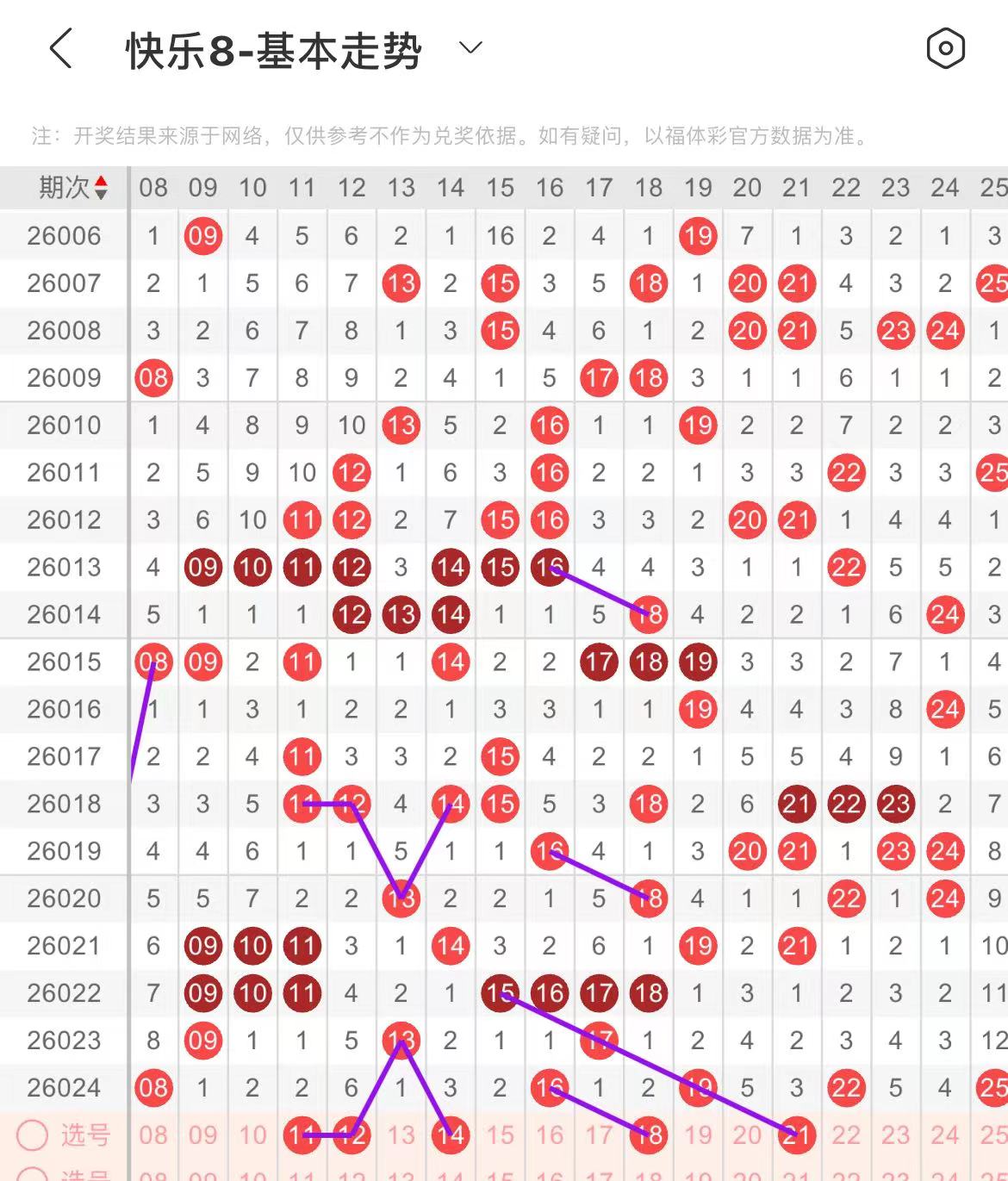 11-20区:本区间上期开出了两个号码,从号码走势图上看,该区现属于热号区,本期号码走势比较强势,出号个数应该能保持在三个号码左右,有出号走势的号码有11.12.14号,复制上面走势形态出号,18号,16对应18出号走势。