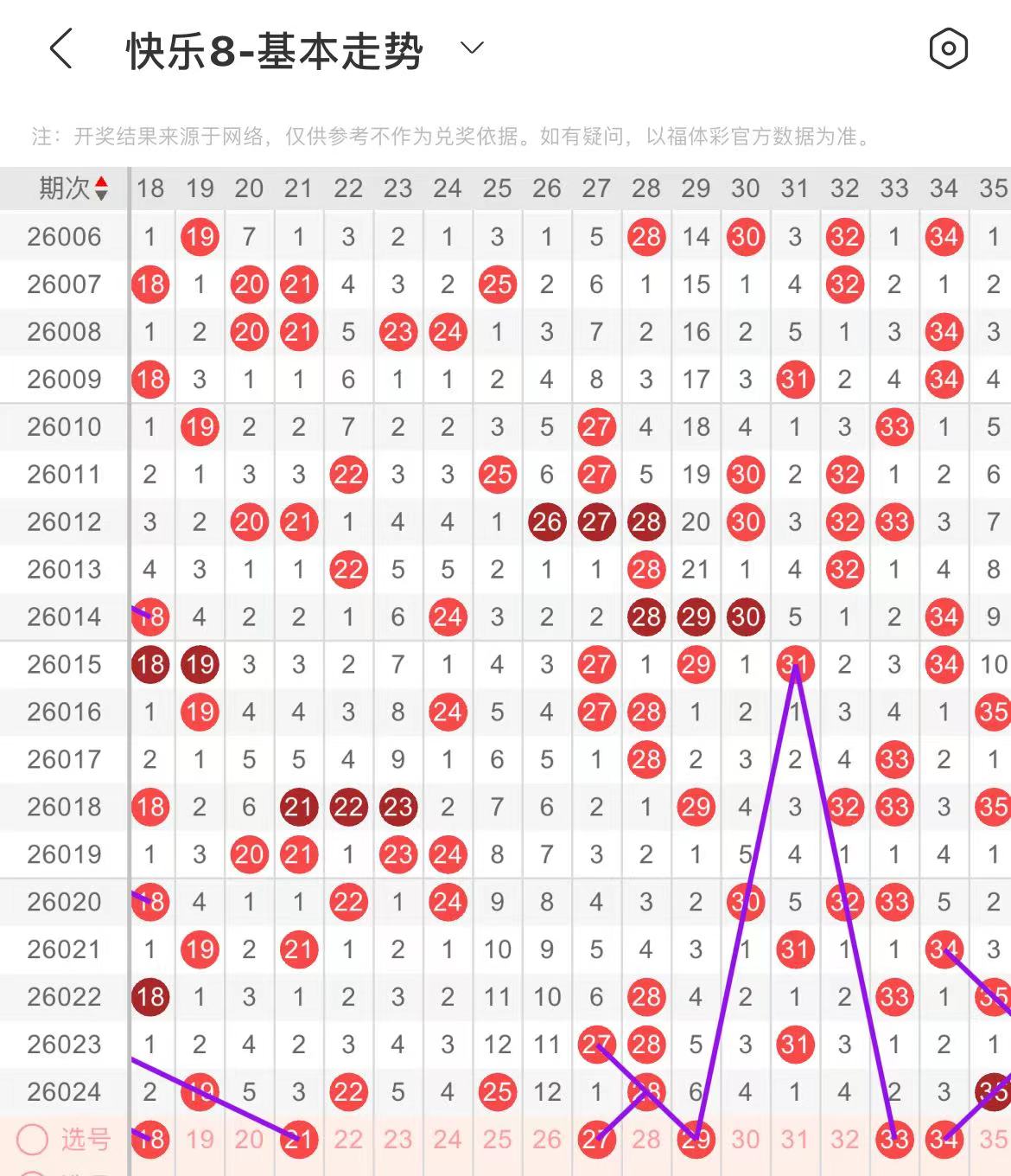 21-30区:本区间上期开出了三个号码,从号码走势图上看,该区号码走势回暖趋势明显,在选号上可考虑三个号码左右,有出号走势的号码有21号,斜连出号走势,27.29号,做分边出号考虑。