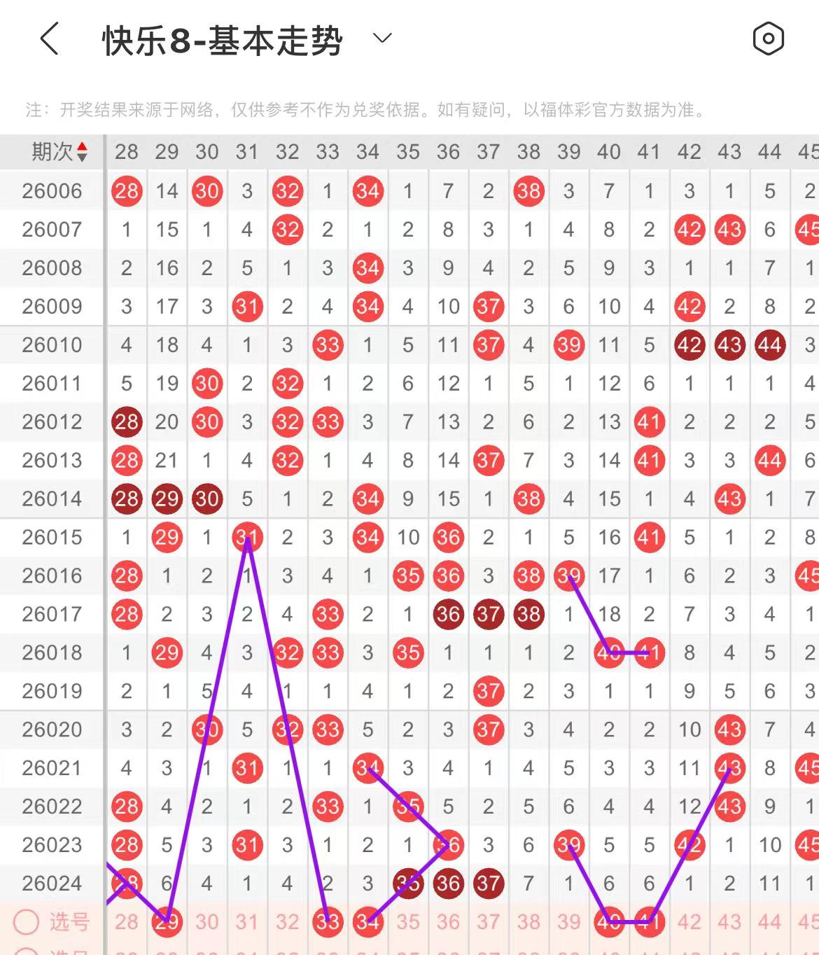 31-40区:本区间上期开出了三个号码,从号码走势图上看,该区现属于温热区,本期重点关注区头区尾号码回补,出号个数在三个号码左右,有出号走势的号码有33号,斜连出号走势,34号,回首掏斜连出号走势,40号,39对应40出号走势。