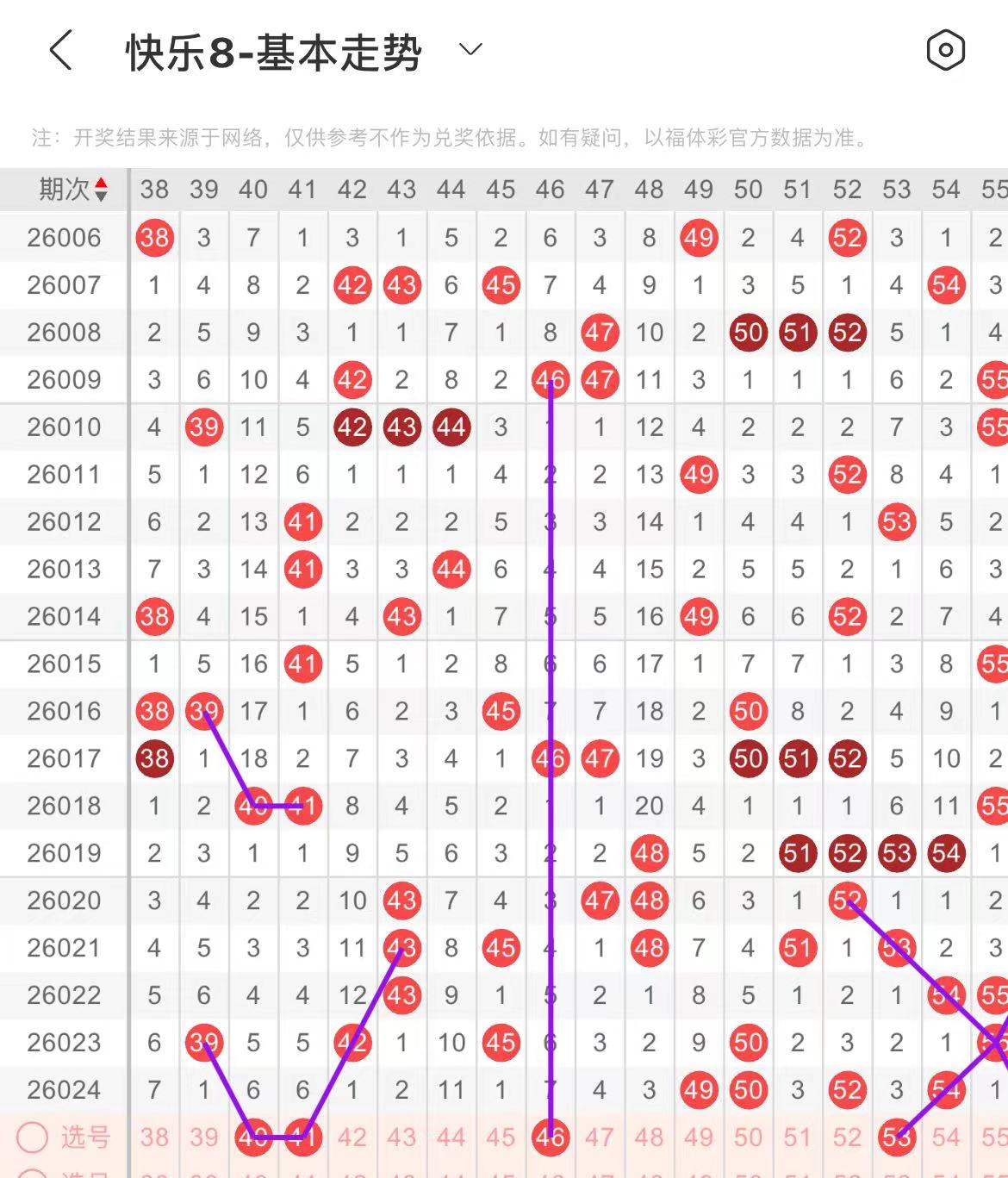 41-50区:本区间上期开出了两个号码,从号码走势图上看,该区现属于冷号区,出号个数在一两个号码左右,有出号走势的号码有41号,斜连出号走势,46号,隔期相同出号走势。