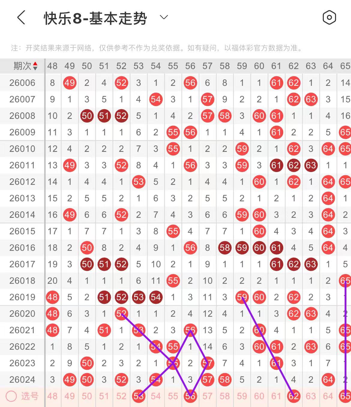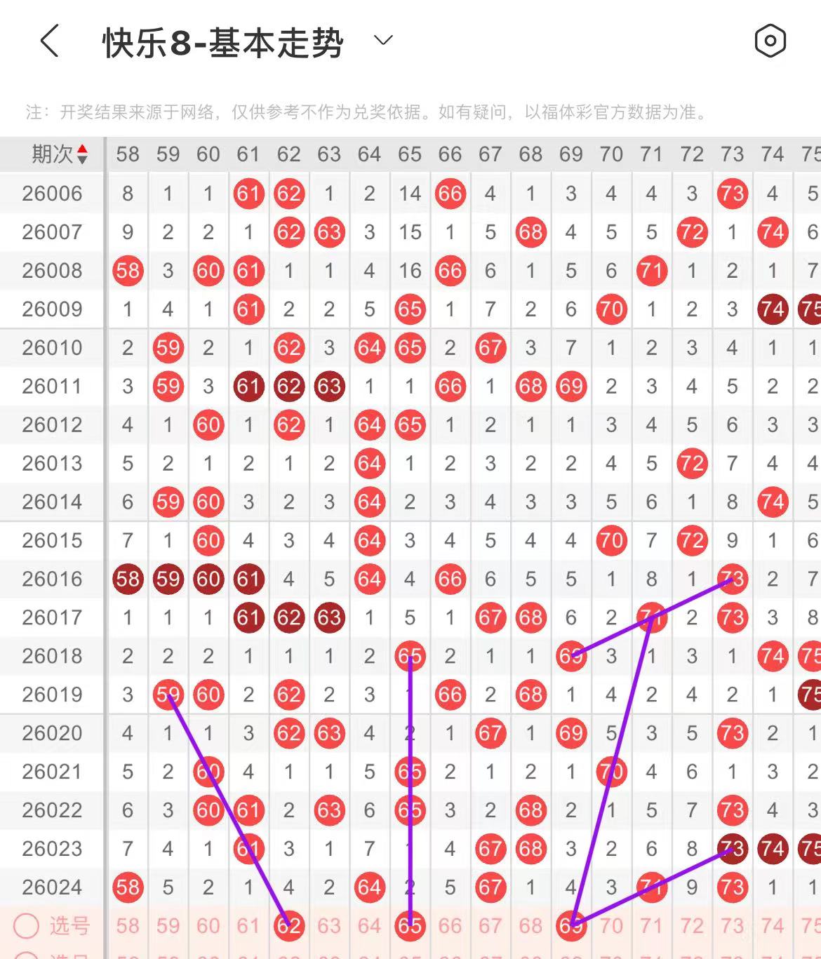 61-70区:本区间上期开出了两个号码,从号码走势图上看,该区现属于温热区,本期号码走势比较强势,出号个数应该有所增加,出号个数在三个号码左右,有出号走势的号码有62号,斜连出号走势,65号,上下对称出号走势,69号,双线斜连出号走势。