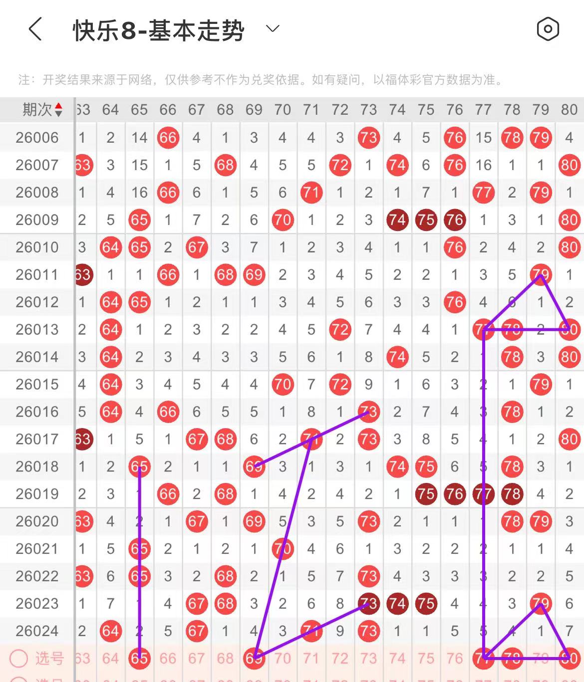 71-80区:本区间上期开出了两个号码,从号码走势图上看,本期重点关注后半区号码回补,出号个数在两个号码左右。有出号走势的号码有77号,隔期相同出号走势,78.80号,隔期分边出号走势。
