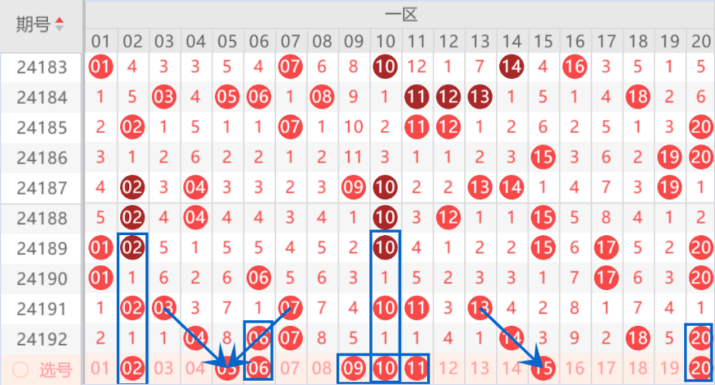 本期的02号数字我们做一下防守就行了,不一定会出号。本期的05号数字是属于遗漏8期的号码,本期遗漏8期的号码有三个,我们注意出一个号码的情况,重点关注一下05 61号数字出一个号码的情况。如果本期的05号数字不出,那么本期的06 07号数字是有机会重一个号码的,我们要注意一下。本期的09 10 11号数字我们注意出连号的情况,其中的10 11号数字有很大机会出一个号码。本期的15号数字我们注意一下出号情况,属于三斜连号码。