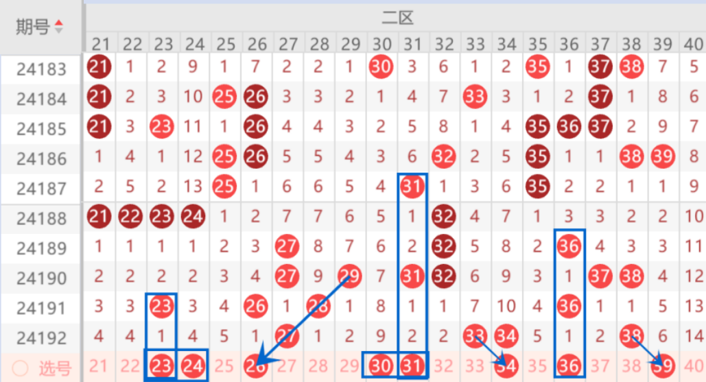 本期的23 24号数字我们注意出一个号码的情况,不建议在这里组胆码。本期的26号数字是属于斜四连号码,出号机会是有的,我们要注意一下。上期的连号空一带号29 31 32号数字没能出现回补,那么本期要不就出30号数字,要不就出29 31 33当中的一个,这里需要注意一下。上期开出了33 34号数字本期我们出一个重号的情况。本期的36 40号数字是属于空三中心号,本期我们注意出以一个号码的情况,其中的36号数字可以重点关注一下。