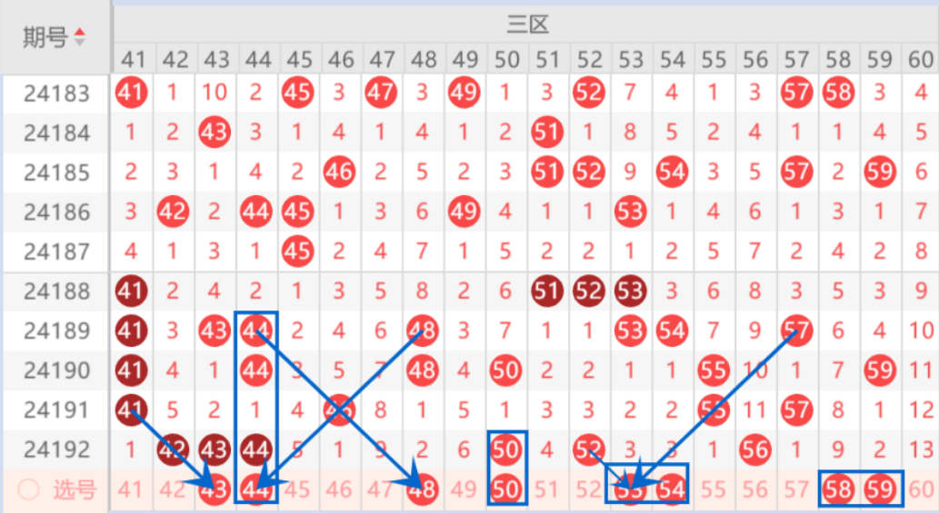 上期开出了42 43 44号数字的连号,本期我们注意一下出重号的情况,这里也是重点关注一下43 44号数字出重号的情况。本期的48号数字我们注意一下出号情况,它和44 48号数字是属于交叉对称号码,是有机会出一个号码的。上期开出了50 52号数字,本期我们注意一下出重号的情况。上期的阶梯号码落下了52号数字,那么本期的53 54号数字我们就要注意落下一个号码的情况了。本期的58 59号数字哦我们注意一下出连号的情况。