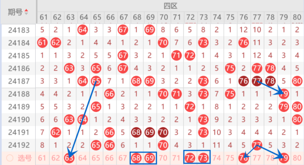 本期的63号数字我们注意一下出号情况,本期的53 63是有机会出号的,我们要注意一下。本期的68 69号数字我们注意出一个号码的情况,重点关注一下69号数字的出号情况就行了。本期的72 73号数字我们注意一下出连号的情况,可以做一下防守的。上期开出了77号数字,那么本期我们注意一下走分边的情况,这里可以注意一下76 79号数字同出的情况。