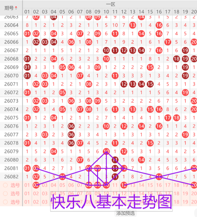 我们先来看下一区的基本走势情况,上期开出了四枚开奖号码,本期预计开出4-5枚开奖号码,首先我们来看同路形态的02 05 08的交替走势,建议02 08考虑二选一。 08 09的二连落位回补建议二选一。10的形态号回首掏。12 20的交叉走势建议二选一。