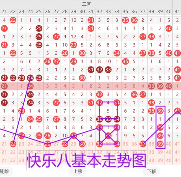 我们来看下二区的基本走势情况,上期开出了六枚开奖号码,本期预计开出4-5枚开奖号码,首先我们来看22的遗漏七期号码带三斜连23的孤码分边重点防守。25 26重号二下一,偏向重点26带双边三斜连落重,32 34交叉走势建议二选一。37的三斜连。 39的空一三重不断形态重点防守。